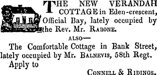 , HPHE NEW VERANDAH ■BWHfci •*• COTTAGE in Eden -crescent, JO 1 RSb Official Bay, lately occupied by WWthe Rev. Mr. Rabone. ALSO The Comfortable Cottage in Bank Street, lately occupied by Mr. Balnevis, 58th Regt. Apply to Connell & Ridings.