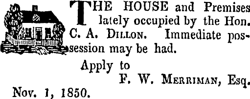 ijfflyf^ r T^HE HOUSE and Premises m^BmL f. lately occupied by the Hon. C. A. Dillon. Immediate posiisssdlllibsession may be had. Apply to F. W. Merriman, Esq. Nov. 1, 1850.