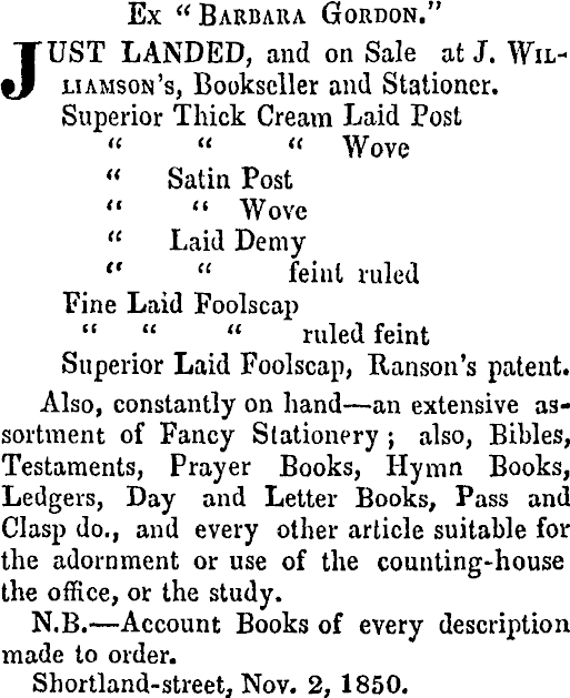 Ex "Barbara Gordon." JUST LANDED, and on Sale at J. Williamsons, Bookseller and Stationer. Superior Thick Cream Laid Post u « u -\y ove " Satin Post " " Wove " Laid Demy " " feint ruled Fine Laid Foolscap " " " ruled feint Superior Laid Foolscap, Ranson's patent. Also, constantly on hand — an extensive assortment of Fancy Stationery ; also, Bibles, Testaments, Prayer Books, Hymn Books, Ledgers, Day and Letter Books, Pass and Clasp do., and every other article suitable for the adornment or use of the counting-house the office, ot the study. N.B. — Account Books of every description made to order. Shortland-street, Nov. 2, 1850.