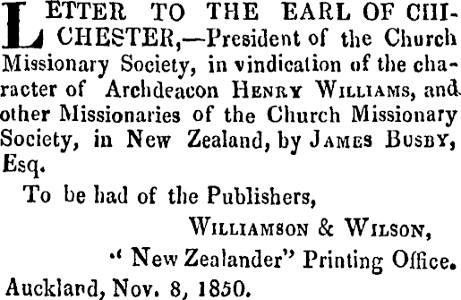 LETTER TO THE EARL OF CIIICHESTER,— President of the Church Missionary Society, in vindication of the character of Archdeacon Henry Williams, and. other Missionaries of the Church Missionary Society, in New Zealand, by James Busby, Esq. To be had of the Publishers, Williamson & Wilson, •' New Zealander'* Printing Office. Auckland, Nov. 8, 1850.