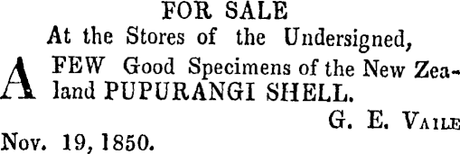 FOR SALE At the Stores of the Undersigned, A FEW Good Specimens of the New Zealand PUPURANGI SHELL. G. E. Vaile Nov. 19,1850.