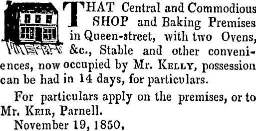 MfTPHAT Central and Commodious J SHOP and Baking Premises in Queen-street, with two Ovens, &c, Stable and other conveniences, now occupied by Mr. Kelly, possession can be had in 14 days, for particulars. For particulars apply on the premises, or to Mr. Keir, Parnell. November 19, 1850,