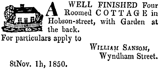 ,-fh a,,.,, yi WELL FINISHED Four fif^T&l £\ Roomed COTTAGEin jSyUUH Hobson-street, with Garden at For particulars apply to William Sansom, Wyndham Street. BtNov. lh, 1850.