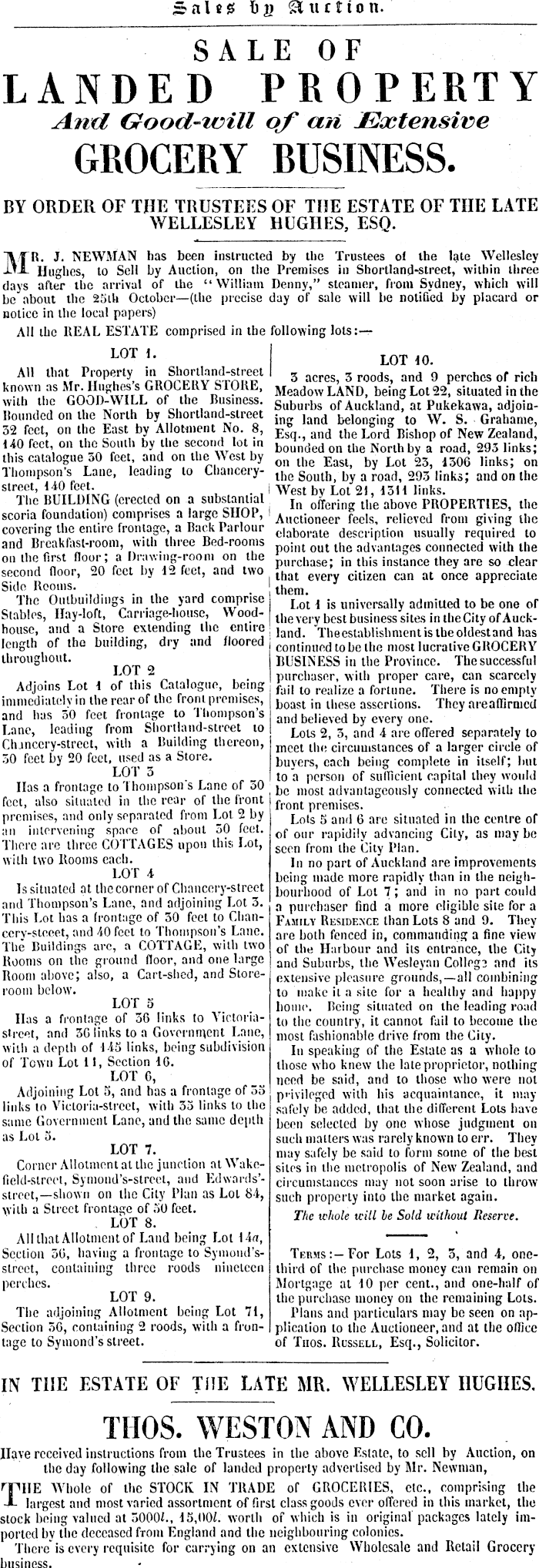 Sales; h2> Auction. SALE OF LANDED PROPERTY And Good-will of an Extensive GROCERY RUSINESS. BY ORDER OF THE TRUSTEES OF THE ESTATE OF THE LATE WELLESLEY HUGHES, ESQ. MR. J. NEWMAN lias been instructed by the Trustees of the late Wellesley Hughes, to Sell by Auction, on the Premises in Shorlland-street, within three days after the arrival of the “William Denny,” steamer, from Sydney, which will be about the 25th October—(the precise day of sale will Lie notified by placard or notice in the local papers) All the REAL ESTATE comprised in the following lots:— LOT 1. All that Property in Shorlland-street known as Mr. Hughes’s GROCERY STORE, with the GOOD-WILL of the Business. Rounded on the North by Shorlland-street 52 feet, on the East by Allotment No. 8, 140 feet, on the South by the second lot in this catalogue 50 feet, and on the West by Thompson’s Lane, leading to Chancerystreet, 140 feet. The BUILDING (erected on a substantial scoria foundation) comprises a large SHOP, covering the entire frontage, a Back Parlour and Breakfast-room, with three Bed-rooms on the first floor; a Drawing-room on the second floor, 20 feet by 12 feet, and two Side Rooms. The Outbuildings in the yard comprise Stables, Hay-loft, Carriage-house, Woodhouse, and a Store extending the entire length of the building, dry and floored throughout. LOT 2 Adjoins Lot 1 of this Catalogue, being immediately in the rear of the front premises, and has 50 feet frontage to Thompson's Lane, leading from Shorlland-street to Chancery-street, with a Building thereon, 50 feet by 20 feet, used as a Store. LOT 5 lias a frontage to Thompson s Lane of 50 feet, also situated in the rear of the Iront premises, and only separated from Lot 2 by an intervening space of about 50 feet. There are three COTTAGES upon this Lot, with two Rooms each. LOT 4 Is situated at thccornerof Chancery-street and Thompson’s Lane, and adjoining Lot 5. This Lot has a frontage of 50 feel to Chan-ccry-stceet, and 40 feel to Thompson’s Lane. The Buildings arc, a COTTAGE, with two Rooms on the ground floor, and one large Room above; also, a Cart-shed, and Storeroom below. LOT 5 Has a frontage of 56 links to Victoriastreet, and 56 links to a Government Lane, with a depth of 145 links, being subdivision of Town Lot 11, Section 16. LOT G, Adjoining Lot 5, and has a frontage of 55 links to Victoria-street, with 55 links to the same Government Lane, and the same depth as Lot 5. LOT 7. Corner Allotment at the junction at Wakc-fiield-slreei, Symond’s-strecl, and Edwards’strcct,—shown on the City Plan as Lot 84, with a Street frontage of 50 feel. LOT 8. All that Allotment of Land being Lot 14 a, Section 56, having a frontage to Symond’sslreet, containing three roods nineteen perches. LOT 9. The adjoining Allotment being Lot 71, Section 56, containing 2 roods, with a frontage to Symond’s street. LOT 10. 3 acres, 3 roods, and 9 perches of rich Meadow LAND, being Lot 22, situated in the Suburbs of Auckland, at Pukekawa, adjoining land belonging to W. S. Grahame, Esq., and the Lord Bishop of New Zealand, bounded on the North by a road, 295 links; on the East, by Lot 23, 1306 links; on the South, by a road, 293 links; and on the West by Lot 21, 1311 links. In offering the above PROPERTIES, the Auctioneer feels, relieved from giving the elaborate description usually required to point out the advantages connected with the purchase; in this instance they are so clear that every citizen can at once appreciate them. Lot 1 is universally admitted to be one of the very best business sites in the City of Auckland. Theeslablisbmenlistheoldestand has continued to be the most lucrative GROCERY BUSINESS in the Province. The successful purchaser, with proper care, can scarcely fail to realize a fortune. There is no empty boast in these assertions. They areaffirmed and believed by every one. Lots 2, 5, and 4 are offered separately to meet the circumstances of a larger circle of buyers, each being complete in itself; but to a person of sufficient capital they would be most advantageously connected with the front premises. Lots 5 and 6 are situated in the centre of of our rapidity advancing City, as may be seen from the City Plan. In no part of Auckland are improvements being made more rapidly than in the neighbourhood of Lot 7; and in no part could a purchaser find a more eligible site for a Family Residence than Lots 8 and 9. They are both fenced in, commanding a fine view of the Harbour and its entrance, the City and Suburbs, the Wesleyan College and its extensive pleasure grounds,—all combining to make it a site for a healthy and happy home. Being situated on the leading road to the country, it cannot fail to become the most fashionable drive from the City. In speaking of the Estate as a whole to those who knew the late proprietor, nothing need be said, and to those who were not privileged with bis acquaintance, it may safely be added, that the different Lots have been selected by one whose judgment on such matters was rarely known to err. They may safely be said to form some of the best silos in the metropolis of New Zealand, and circumstances may not soon arise to throw such property into the market again. The whole will be Sold without Reserve. Terms:— For Lots i, 2, 3, and 4, onethird of the purchase money can remain on Mortgage at 10 per cent., and one-half of the purchase money on the remaining Lots. Plans and particulars may be seen on application to the Auctioneer, and at the office of Titos. Russell, Esq., Solicitor. IN THE ESTATE OF THE LATE MR. WELLESLEY HUGHES. THOS. WESTON AND CO. Have received instructions from the Trustees in the above Estate, to sell by Auction, on the day following the sale of landed properly advertised by Mr. Newman, rpilE Whole of the STOCK IN TRADE of GROCERIES, etc., comprising the JL largest and most varied assortment of first class goods ever offered in this market, the slock being valued at 5000 L, 15,00 L worth of which