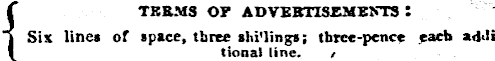 ( TKEMS OF ADVEKTISEMENTS : Six line* of space, three shi'lings; thrce-pcnce each ad»li I tional line. t