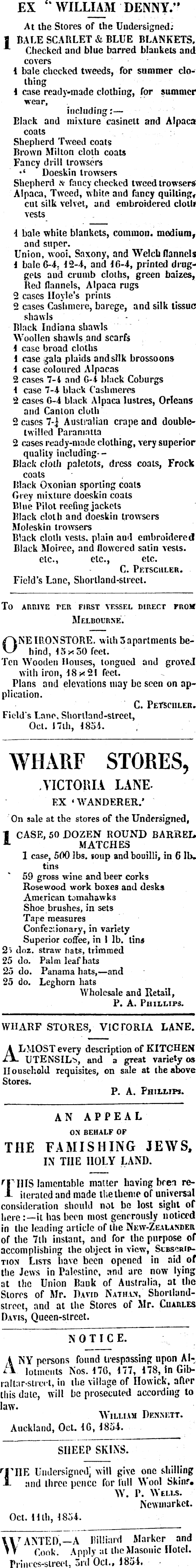 EX “WILLIAM DENNY.” At the Stores of the Undersigned. | BALE SCARLET & BLUE BLANKETS, 1 Checked and blue barred blankets and covers i bale checked tweeds, for summer clothing 1 case ready-made clothing, for summer wear, including:— Black and mixture casinelt and Alpaca coals Shepherd Tweed coats Brown Milton cloth coals Fancy drill trowsers Doeskin trowsers Shepherd » fancy checked tweed trowsers Alpaca, Tweed, white and fancy quilting f cut silk velvet, and embroidered cloth vests 1 bale while blankets, common, modium, and super. Union, wooi, Saxony, and Welch flannels 4 bale 6-4. 12-4, and 16-4, printed druggets and crumb cloths, green baizes, Bed flannels. Alpaca rugs 2 cases Hoyle’s prints 2 cases Cashmere, barege, and silk tissue shawls Black Indiana shawls Woollen shawls and scarfs 1 case broad cloths 1 case gala plaids and silk brossoons 1 case coloured Alpacas 2 cases 7-4 and 6-4 black Coburgs 1 case 7-4 black Cashmeres 2 cases 6-4 black Alpaca lustres, Orleans and Canton cloth 2 cases Australian crape and doubletwilled Paramatta 2 cases ready-made clothing, very superior quality including - Black cloth paletots, dress coals, Frock coals Black Oxonian sporting coals Grey mixture doeskin coals Blue Pilot reefing jackets Black cloth and doeskin trowsers Moleskin trowsers Black cloth vests, plain and embroidered Black Moirec, and flowered satin vests, etc., etc., etc. C. Petsculer. Field’s Lane, Shorlland-strecl. To ARRIVE PER FIRST VESSEL DIRECT FROM Melbourne. ONE IRON STORE, with 3 apartments behind, 43x 50 feet. Ten Wooden Houses, tongued and groveJ with iron, 48x2! feet. Plans and elevations may be seen on application. C. Petsculer. Field s Lane, Shorlland-slreel, Oct. 17th, 4834. WHARF STORES, VICTORIA LANEEX ‘WANDERER.’ On sale at the stores of the Undersigned, ICASE, 50 DOZEN ROUND BARREL. MATCHES 1 case, 500 lbs. soup and bouilli, in 6 lb. tins 59 gross wine and beer corks Rosewood work boxes and desks American tomahawks Shoe brushes, in sets Tape measures Confec;ionary, in variety Superior coffee, in 1 lb. tins doz. straw hats, trimmed 25 do. Palm leaf hats 25 do. Panama hats, —and 25 do. Leghorn hats Wholesale and Retail, P. A. Phillips. WHARF STORES, VICTORIA LANE. A LMOST every description of KITCHEN XL and a great variety os Household requisites, on sale at the above Stores. P. A. Phillips. AN APPEAL ON BEHALF OF THE FAMISHING JEWS, IN THE HOLY LAND. r r iIIS lamentable matter having been re--1 iterated and made the theme of universal consideration should not be lost sight of here:—it has been most generously noticed in the leading article of the New-Zealander of the Tih instant, and for the purpose of accomplishing the object in view, Subscription Lists have been opened in aid of the Jews in Palestine, and arc now lying at the Union Bank of Australia, at the Stores of Mr. David Nathan, Shorllandstreet, and at the Stores of Mr. Cuarles Davis, Queen-street. NOTICE. i NY persons found trespassing upon AIA lolmciits Nos. 4 76, 177, 478, in Uib-rallar-streel, in the village of Ilowick, after this dale, will be prosecuted according to law. William Dennett. Auckland, Oct. 46, 4834. SHEEP SKINS. r |' , llE Undersigned] will give one shilling i- and three pence for lull Wool Skinr, W. P. Wells. Newmarket. Oct. 4 4 th, 1834. WANTED,— A Billiard Marker and Cook. Apply at the Masonic Hotel. Prim cs-streel, on I Ocl., 1834.