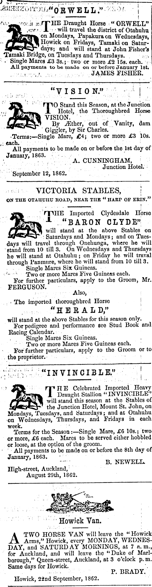 . ——r"ORWELL/ THE Draught Horse “ORWELL” will travel the district of Otahuhu on Mondays, Papakura on Wednesdays, | Howick on Fridays, Tamaki on Saturdays; and will stand at John Fisher’s Tamaki Bridge, on Tuesdays and Thursdays. Single Mares £3 35.; two or more £2 15s. each. All payments to be made on or before January Ist. JAMES FISHER. ■ :! "V I S I 0 N” TO Stand this Season, at the Junction Hotel, the Thoroughbred Horse VISION. By ./Ether, out of Vanity, dam Giggler, by Sir Charles. Terms:—Single Marc, £4-, two or more £3 10s. each. All payments to be made on or before the Ist day of January, 1863. A. CUNNINGHAM, Junction Hotel. September 12, 1862. VICTORIA STABLES, ON THE OTATIDIIU ROAD, NEAR TUB “ HARP OF ERIN.” rpilE Imported Clydesdale Horse A “BARON CLYDE” will stand at the above Stables on Saturdays and Mondays; and on Tuesdays will travel through Onehunga, where he will stand from 10 till 3. On Wednesdays and Thursdays ho will stand at Otahuhu; on Friday he will traval through Panmure, where ho will stand from 10 till 3. Single Marcs Six Guineas. Two or more Marcs Five Guineas each. For further particulars, apply to the Groom, Mr. FERGUSON. Also, The imported thoroughbred Horse " H E R A L D,” will stand at the above Stables for this season only. For pedigree and performance see Stud Book and Racing Calendar. Single Mares Six Guineas. Two or more Mares Five Guineas each. For further particulars, apply to the Groom or to the proprietor. “INVINCIBLE” THE Celebrated Imported Heavy Draught Stallion “INVINCIBLE” will stand this season at the Stables of ___ the Junction Hotel, Mount St. John, on Mondays, Tuesdays, and Saturdays; and at Otahuhu on Wednesdays, Thursdays, and Fridays in each Terms for the Season :—Single Mare, £6 10s.; two or more, £6 each. Marcs to be served either hobbled or loose, at the option of the groom. All payments to be made on or before the Bth day of January, 1863. B. NEWELL. High-street, Auckland, August 29th, 1862. Howick Van. A TWO HORSE VAN will leave the “ Howick Arms,” Howick, every MONDAY, WEDNESDAY, and SATURDAY MORNINGS, at 7 a. m., for Auckland, and will leave the “Duke of Marlborough,” Queen-street, Auckland, at 3 o’clock p. m. Same days for Howick. P. BRADY. Howick, 22nd September, 1862.