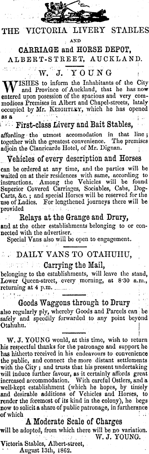 THE VICTORIA LIVERY STABLES AND CARRIAGE and HORSE DEPOT, ALBERT-STREET, AUCKLAND. W. J. YOUNG WISHES to inform the Inhabitants of the City and Province of Auckland, that he has now entered upon posession of the spacious and very commodious Premises in Albert and Chapel-streets, lately occupied by Mr. Keigixtlkv, which he has opened as a First-class Livery and Bait Stables, affording the utmost accomodation in that line; together with the greatest convenience. The premises adjoin the Clanricardc Hotel, of Mr. Dignan. Vehicles of every description and Horses can be ordered at any time, and the parties will be waited on at their residences with same, according to instructions. Among the Vehicles will be found Superior Covered Carriages, Sociables, Cabs, DogCarts, &c. ; and special Horses will be reserved for the use of Ladies. For lengthened journeys there will be provided Relays at the Grange and Drury, and at the other establishments belonging to or connected with the advertiser. Special Vans also will be open to engagement. DAILY VANS TO OTAHUHU, Carrying the Mail, belonging to the establishments, will leave the stand, Lower Queen-street, every morning, at 8-30 a.m., returning at 4 p.m. Goods Waggons through to Drury also regularly ply, whereby Goods and Parcels can be safely and speedily forwarded to any point bevond Otahuhn. W. J. YOUNG would, at this time, wish to return his respectful thanks for the patronage and support he has hitherto received in his endeavours to convenience the public, and connect the more distant settlements with the City ; and trusts that his present undertaking will induce further favour, as it certainly affords great increased accommodation. With careful Ostlers, and a well-kept establishment (which he hopes, by timely and desirable additions of Vehicles and Horses, to render the foremost of its kind in the colony), he begs now to solicit a share of public patronage, in furtherance of which A Moderate Scale of Charges will be adopted, from which there will be no variation. W. J, YOUNG. Victoria Stables, Albert-street, August 13th, 1862.