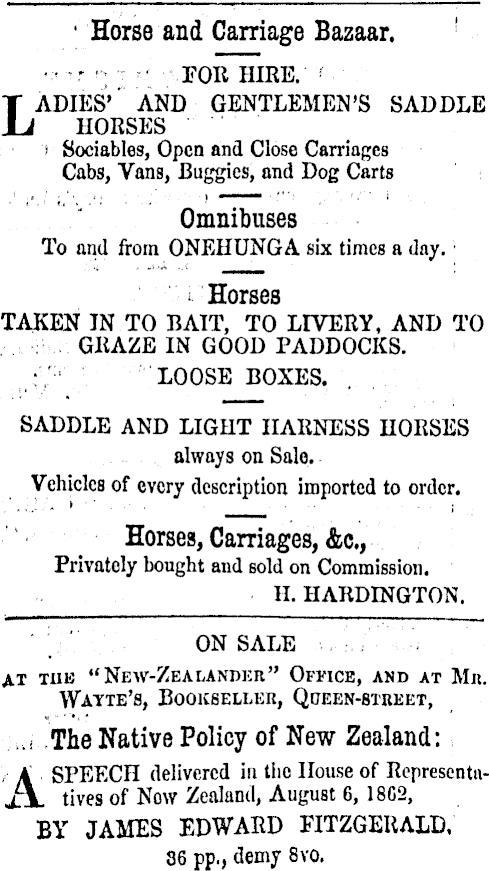 Horse and Carriage Bazaar, rou hire. LADIES’ AND GENTLEMEN’S SADDLE HORSES Sociables, Open and Close Carriages Cabs, Vans, Buggies, and Dog Carts Omnibuses To and from ONEHUNGA six times a day. Horses TAKEN IN TO BAIT, TO LIVERY, AND TO GRAZE IN GOOD PADDOCKS. LOOSE BOXES. SADDLE AND LIGHT HARNESS HORSES always on Sale. Vehicles of every description imported to order. Horses, Carriages, &c., Privately bought and sold on Commission. H. lIARLINGTON. ON SALE AT THE “ NeW-Ze A LANDER” OFFICE, AND AT Mil. Wayte’s, Bookseller, Queen-street, The Native Policy of New Zealand: A SPEECH delivered in the House of RepresentaXX tives of Now Zealand, August G, 18C2, BY JAMES EDWARD FITZGERALD. 36 pp., demy Bvo.