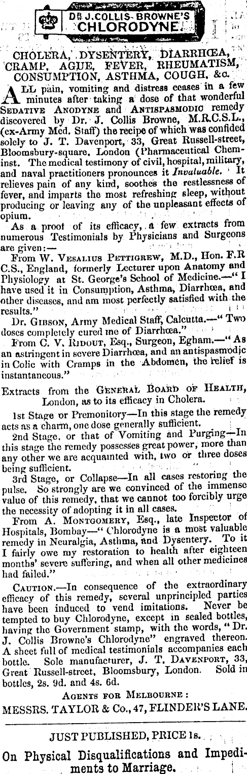 D 8 J.COLLIS BROWNE’S CHLORODYNE* CHOLERA, DYSENTERY, DIARRHOEA, CRAMP. AGUE. FEVER, RHEUMATISM, CONSUMPTION, ASTHMA, COUGH. &o. ALL pain, vomiting and distress ceases in a few minutes after taking a dose of that wonderful Sedative Anodyne and Antispasmodio remedy discovered hy Dr. J. Collis Browne, M.R.C.S.L., (cx-Army Med. Staff) the recipe of which was confided solely to J. T. Davenport, 33, Great Russell-street, Bloomsbury-squarc, London (Pharmaceutical Cheminst. The medical testimony of civil, hospital, military, and naval practitioners pronounces it Invaluable. It relieves pain of any kind, soothes the restlessness of fever, and imparts the most refreshing sleep, without producing or leaving any of the unpleasant effects of opium. As a proof of its efficacy, a few extracts from numerous Testimonials by Physicians and Surgeons are given:— From W. Vesalius Pettigrew, M.D., Hon. F.K C.S.. England, formerly Lecturer upon Anatomy and Physiology at St. George’s School of Medicine.—“ I have used it in Consumption, Asthma, Diarrhcea, and other diseases, and am most perfectly satisfied with the results.” Dr. Gibson, Army Medical Staff, Calcutta. —“ Two doses completely cured me of Diarrhoea.” From C. V. Kiduut, Esq., Surgeon, Egham—“ As an astringent in severe Diarrhcea, and an antispasmodic in Colic with Cramps in the Abdomen, the relief is instantaneous.” Extracts from the GteNEhAL Board of Health, London, as to its efficacy in Cholera. Ist Stage or Premonitory—ln this stage the remedy acts as a charm, one dose generally sufficient. _ 2nd Stage, or that of Vomiting and Purging—ln this stage the remedy possesses great power, more than any other we arc acquainted with, two or three doses being sufficient. . 3rd Stage, or Collapse—ln all cases restoring the pulse. So strongly are we convinced of the immense value of this remedy, that we cannot too forcibly urge the necessity of adopting it in all cases. From A. Montgomery, Esq., late Inspector ot Hospitals, Bombay—“ Chlorodyne is a most valuable remedy in Neuralgia, Asthma, and Dysentery, lo it I fairly owe ray restoration to health after eighteen months’ severe suffering, and when all other medicines had failed.” Caution. —In consequence of the extraordinary efficacy of this remedy, several unprincipled parties have been induced to vend imitations. Never be tempted to buy Chlorodyne, except in scaled bottles, having the Government stamp, with the words, Dr. J. Collis Browne’s Chlorodyne” engraved thereon. A sheet full of medical testimonials accompanies each bottle. Sole manufacturer, J. T. Davenport, 33, Great Russell-street, Bloomsbury, London. Sold in bottles, 2s. !id. and 4s. 6d. Agents for Melbourne : MESSRS. TAYLOR & Co., 47, FLINDER’S LANE. JUST PUBLISHED, PRICE Is. On Physical Disqualifications and Impediments to Marriage.