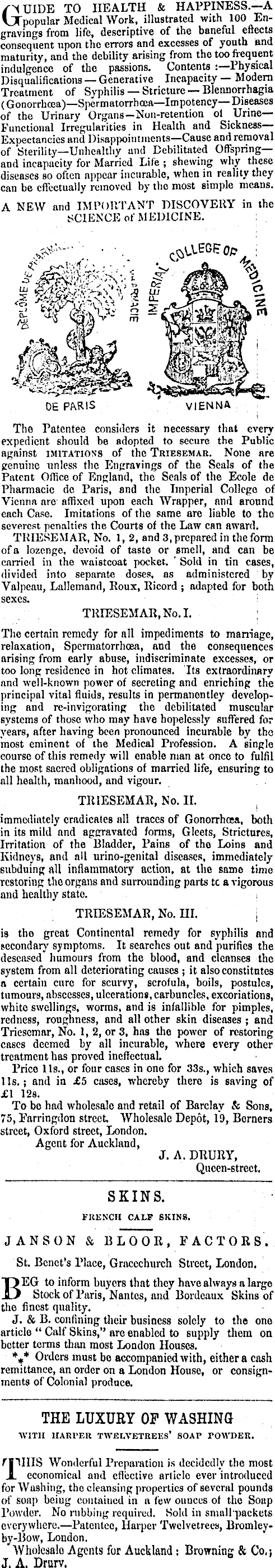 Guide to health & happiness.—a popular Medical Work, illustrated with 100 Engravings from life, descriptive of the baneful effects consequent upon the errors and excesses of youth and maturity, and the debility arising from the too frequent indulgence of the passions. Contents Physical Disqualifications Generative Incapacity Modem Treatment of Syphilis Stricture Blennorrhagia (Gonorrhoea)— Spermatorrhoea—Impotency— Diseases of the Urinary Organs—Non-retention ol Urine— Functional Irregularities in Health and Sickness — Expectancies and Disappointments —Cause and removal of Sterility—Unhealthy and Debilitated Offspring—and incapacity for Married Life ; shewing why these diseases so often appear incurable, when in reality they can be effectually removed by the most simple means. A NEW and IMPORTANT DISCOVERY in the SCIENCE of MEDICINE. op <- S-r, <o m s r M DE PARIS VIENNA The Patentee considers it necessary that every expedient should bo adopted to secure the Public against imitations of the Triesemar. None are genuine unless the. Engravings of the Seals of the Patent Office of England, the Seals of the Ecole dc Pharmacic dc Paris, and the Imperial College of Vienna are affixed upon each Wrapper, and around each Case. Imitations of the same are liable to the severest penalties the Courts of the Law can award, TRIESEMAR, No. 1, 2, and 3, prepared in the form of a lozenge, devoid of taste or smell, and can be carried in the waistcoat pocket. ‘ Sold in tin cases, divided into separate doses, as administered by Valpeau, Lallemand, Roux, Ricord ; adapted for both sexes. TRIESEMAR, No. I. The certain remedy for all impediments to marriage, relaxation, Spermatorrhoea, and the consequences arising from early abuse, indiscriminate excesses, or too long residence in hot climates. Its extraordinary and well-known power of secreting and enriching the principal vital fluids, results in permanontley developing and re-invigorating the debilitated muscular systems of those who may have hopelessly suffered for years, after having been pronounced incurable by the most eminent of the Medical Profession. A single course of this remedy will enable man at once to fulfil the most sacred obligations of married life, ensuring to all health, manhood, and vigour. TRIESEMAR, No. 11. immediately eradicates all traces of Gonorrhoea, both in its mild and aggravated forms, Gleets, Strictures, Irritation of the Bladder, Pains of the Loins and Kidneys, and all urino-genital diseases, immediately subduing all inflammatory action, at the same time restoring the organs and surrounding parts tc a vigorous and healthy state. TRIESEMAR, No. HI. is the great Continental remedy for syphilis and secondary symptoms. It searches out and purifies the descascd humours from the blood, and cleanses the system from all deteriorating causes ; it also constitutes a certain cure for scurvy, scrofula, boils, postulcs, tumours, abscesses, ulcerations, carbuncles, excoriations, white swellings, worms, and is infallible for pimples, redness, roughness, and all other skin diseases ; and Triescmar, No. 1, 2, or 3, has the power of restoring cases deemed by all incurable, where every other treatment has proved ineffectual. Price 11s., or four cases in one for 335., which saves 1 Is,; and in £5 cases, whereby there is saving of £1 12s. To be had wholesale and retail of Barclay & Sous, 75, Earringdon street. Wholesale Depot, 19, Berners street, Oxford street, London. Agent for Auckland, J. A. DRURY, Queen-street. SKINS. FRENCH CALF SKINS. JAN S0 N & BLO OR, FACTORS. St. Bcnct’s Place, Gracechurch Street, London. BEG to inform buyers that they have always a largo Stock of Paris, Nantes, and Bordeaux Skins of the finest quality. J. & B. confining their business solely to the one article “ Calf Skins,” arc enabled to supply them on better terms than most London Houses. *** Orders must bo accompanied with, either a cash remittance, an order on a London House, or consignments of Colonial produce. THE LUXURY OP WASHING WITH HARTER TWELVETREES’ SOAP POWDER, mills Wonderful Preparation is decidedly the most A economical and effective article ever introduced for Washing, the cleansing properties of several pounds of soap being contained in a few ounces of the Soap I Powder. No nibbing required. Sold in small packets everywhere.—Patentee, Harper Twelvetrees, Bromley-by-Bow, Loudon. Wholesale Agents for Auckland : Browning & Co,; 1 J. A. Drurv.