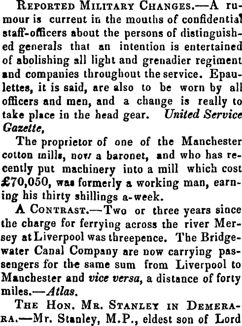 Reported Military Changes. — A rumour is current in the mouths of confidential staff-officers about the persons of distinguished generals thai an intention is entertained of abolishing all light and grenadier regiment and companies throughout the service. Epaulettes, it is said, are also to be worn by all officers and men, and a change is really to take place in the head gear. United Service Gazette, The proprietor of one of the Manchester cotton unlit, nor/ a baronet, and who has recently put machinery into a mill which cost £70,050, was formerly a working man, earning his thirty shillings a- week. A Coktrast. — Two or three years since the charge for ferrying across the river Mersey at Liverpool was threepence. The Bridgewater Canal Company are now carrying passengers for tbe same sum from Liverpool to Manchester and vice versa, a distance of forty miles. — Atlas. The Hon. Mr. Stanley in Demerara. — Mr. Stanley, M.P., eldest son of Lord