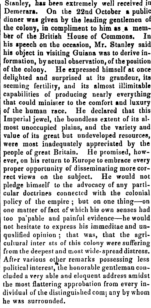 Stanley, has been extremely we] l received in Demerara. On the 22nd October a public dinner was given by the leading gentlemen of the colony, in compliment to him as .a member of the British House of Commons. In his speech on the occasion, Mr. Stanley said his object in visiting Guiana was to derive information, by actual observation, of the position of the colony. He expressed himself at once delighted and surprised at its grandeur, its seeming fertility, and its almost illimitable capabilities of producing nearly everything that could minister to the comfort and luxury of the human race. He declared that this Imperial jewel, the boundless extent of its almost unoccupied plains, and the variety and value of its great but undeveloped resources, were most inadequately appreciated by the people of great Britain. He promised, however, on his return to Europe to embrace every proper opportunity of disseminating more correct views on the subject. He would not pledge himself to the advocacy of any particular doctrines connected with the colonial policy of the empire ; but on one thing — on one matter of fact of which his own senses had too pa'pable and painful evidence — he would not hesitate to express his immeditae and unqualified opinion ; that was, that the agricultural inter sts of this colony were suffering from the deepest and most wide- spread distress. After various other remarks possessing less political interest, the honorable gentleman concluded a very able and eloquent address amidst the most flattering approbation from every individual of the distinguished com] any by whom he was surrounded.