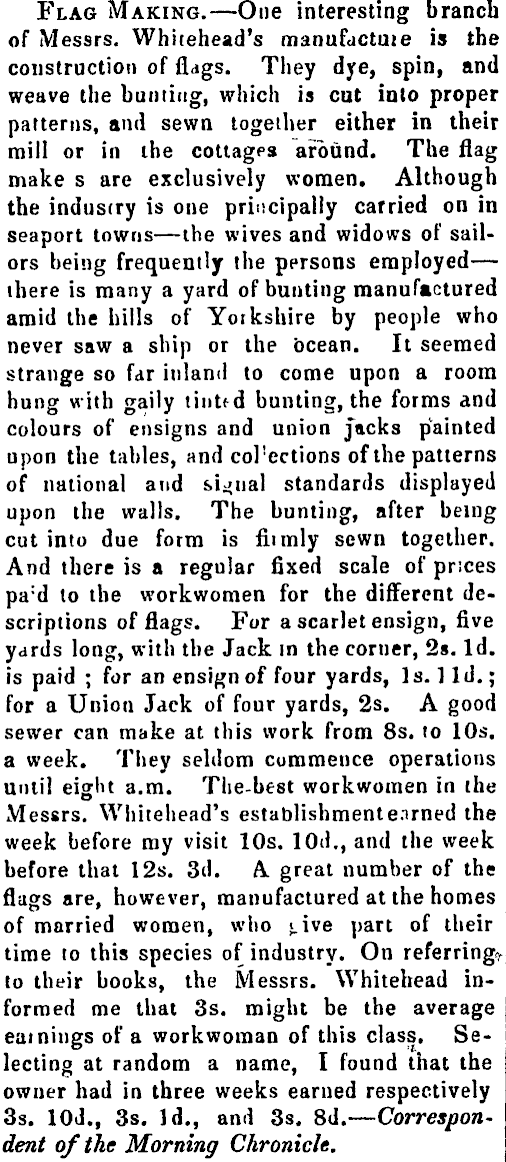 Flag Making. — One interesting branch of Messrs. Whiteheads manufcictute is the construction of flags. They dye, spin, and weave the bunting, which is cut into proper patterns, and sewn together either in their mill or in the cottages around. The flag make s are exclusively women. Although the industry is one principally carried on in seaport towns — the wives and widows of sailors being frequently the pprsons employed — there is many a yard of bunting manufactured amid the hills of Yorkshire by people who never saw a ship or the ocean. It seemed strange so far inland to come upon a room hung with gaily tinted bunting, the forms and colours of ensigns and union Jacks painted upon the tables, and col'ections of the patterns of national and signal standards displayed upon the walls. The bunting, after being cut into due form is fiimly sewn together. And there is a regular fixed scale of prices pa : d to the workwomen for the different descriptions of flags. For a scarlet ensign, five yards long, with the Jack in the comer, 2s. Id. is paid ; far an ensign of four yards, Is. ] Id. ; for a Union Jack of four yards, 2s. A good sewer can make at this work from Bs. to 10s. a week. They seldom commence operations until eight a.m. The-best workwomen in the Messrs. Whiteheads establishment earned the week before my visit 10s. 10d M and the week before that 12s. 3d. A. great number of the flags are, however, manufactured at the homes of married women, who j.ive part of their time to this species of industry. On referring^ to their books, the Messrs. Whitehead informed me that 3s. might be the average earnings of a workwoman of this class. Selecting at random a name, I found that the owner had in three weeks earned respectively 3s. 10J., 3s. Id., and 3s. 8d. — Correspondent of the Morning Chronicle.
