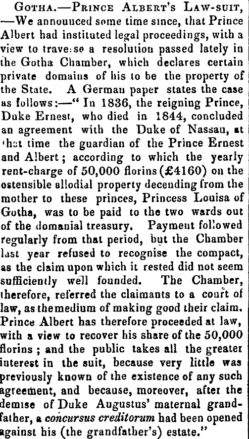 Gotha. — Prince Albert's Law-suit, — We announced some time since, that Prince Albert had instituted legal proceedings, with a view to traveise a resolution passed lately in the Gotha Chamber, which declares certain private domains of his to be the property of the State. A Germau paper states the case as follows: — " In 1836, the reigning Prince, Duke Ernest, who died in 1844, concluded an agreement with the Duke of Nassau, it •hat time the guardian of the Prince Ernest and Albert ; according to which the yearly rent-charge of 50,000 florins (£4160) on the ostensible allodial property decending from the mother to these princes, Princess Louisa of Gotha, was to be paid to the two wards out of the domanial treasury. Payment followed regularly from that period, but the Chamber last year refused to recognise the compact, as the claim upon which it rested did not seem sufficiently well founded. The Chamber, therefore, referred the claimants to a court of lav, as tbemedium of making good their claim. Prince Albert has therefore proceeded at law, with a view to recover his share of the 50,000 florins ; and the public takes all the greater interest in the suit, because very little was previously known of the existence of any such agreement, and because, moreover, aftei the demise of Duke Augustus' maternal grandfather, a cohcursus creditorum had been opened against bis (the grandfather's) estate."