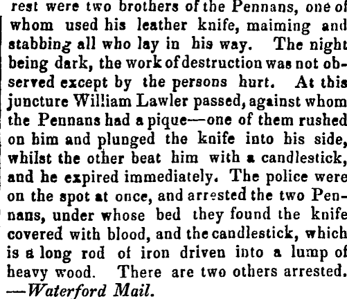 rest were two brothers of the Pennans, one of whom used his leather knife, maiming and stabbing all who lay in his way. The night being dark, the work of destruction was not obserred except by the persons hurt. At this juncture William Lawler passed, against whom the Pennans had a pique — one of them rushed on him and plunged the knife into bis side, whilst the other beat him with a candlestick, and he expired immediately. The police were on the spot at once, and arrested the two Pennans, under whose bed they found the knife covered with blood, and the candlestick, which is & long rod of iron driven into a lump of heavy wood. There are two others arrested. — Waterford Mail.