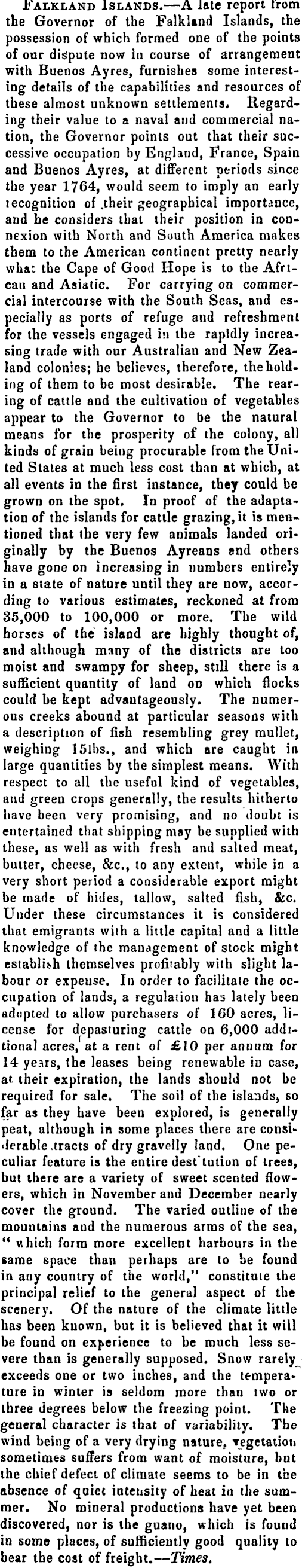 Falkland Islands. — A late report from the Governor of the Falkland Islands, the possession of which formed one of the points of our dispute now in course of arrangement with Buenos Ayres, furnishes some interesting details of the capabilities and resources of these almost unknown settlements. Regarding their value to a naval and commercial nation, the Governor points out that their successive occupation by England, France, Spain and Buenos Ayres, at different periods since the year 1764, would seem to imply an early tecognition of .their geographical importance, and he considers that their position in connexion with North and South America makes them to the American continent pretty nearly what the Cape of Good Hope is to the African and Asiatic. For carrying on commercial intercourse with the South Seas, and especially as ports of refuge and refreshment for the vessels engaged in the rapidly increasing trade with our Australian and New Zealand colonies; he believes, therefore, the holding of them to be most desirable. The rearing of cattle and the cultivation of vegetables appear to the Governor to be the natural means for the prosperity of the colony, all kinds of grain being procurable from the United States at much less cost than at which, at all events in the first instance, they could be grown on the spot. In proof of the adaptation of the islands for cattle grazing, it is mentioned that the very few animals landed originally by the Buenos Ayreans and others have gone on increasing in numbers entirely in a state of nature until they are now, according to various estimates, reckoned at from 35,000 to 100,000 or more. The wild horses of the island are highly thought of, and although many of the districts are too moist and swampy for sheep, still there is a sufficient quantity of land oo which flocks could be kept advautageously. The numerous creeks abound at particular seasons with a description of fish resembling grey mullet, weighing 15 1b5., and which are caught in large quantities by the simplest means. With respect to all the useful kind of vegetables, and green crops generally, the results hitherto have been very promising, and no doubt is entertained that shipping may be supplied with these, as well as with fresh and salted meat, butter, cheese, &c, to any extent, while in a very short period a considerable export might be made of hides, tallow, salted fish, &c. Under these circumstances it is considered that emigrants with a little capital and a little knowledge of the management of stock might establish themselves profitably with slight labour or expeuse. In order to facilitate the occupation of lands, a regulation has lately been adopted to allow purchasers of 160 acres, license for depasturing cattle on 6,000 additional acres, at a rent of £10 per annum for 14 years, the leases being renewable in case, at their expiration, the lands should not be required for sale. The soil of the islands, so far as they have been explored, is generally peat, although in some places there are considerable .tracts of dry gravelly land. One peculiar feature is the entire dest'tution of trees, but there are a variety of sweet scented flowers, which in November and December nearly cover the ground. The varied outline of the mountains and the numerous arms of the sea, " which form more excellent harbours in the same space than peihaps are to be found in any country of the world," constitute the principal relief to the general aspect of the scenery. Of the nature of the climate little has been known, but it is believed that it will be found on experience to be much less severe than is generally supposed. Snow rarely exceeds one or two inches, and the temperature in winter is seldom more than two or three degrees below the freezing point. The general character is that of variability. The wind being of a very drying nature, vegetation sometimes suffers from want of moisture, but the chief defect of climate seems to be in the absence of quiet intensity of heat in the summer. No mineral productions have yet been discovered, nor is the guano, which is found in some places, of sufficiently good quality to bear the cost of freight. — Times.