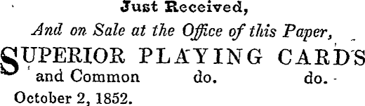 Just Received, And on Sale at the Office of this Paper, gXJPERIOR PLAYING CARDS and Common do. do. - October 2, 1852.