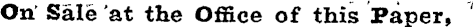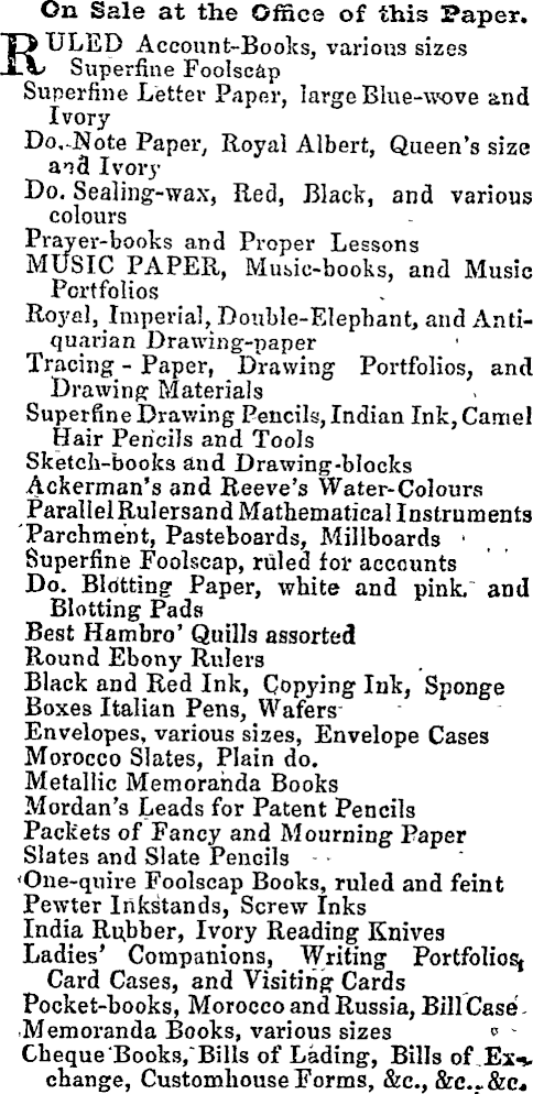 On Sale at the Office of this Paper. RULED Account-Books, various sizes Superfine Foolscap Superfine Letter Paper, large Blue-wove and Ivory Do,-Note Paper, Royal Albert, Queen's size ai3 Ivory Do. Sealing-wax, Reel, Black, and various colours Prayer-books and Proper Lessons MUSIC PAPER, Mubic-books, and Music Portfolios Royal, Imperial, Doiible-Elepbant, and Antiquarian Drawing-paper Tracing - Paper, Drawing Portfolios, and Drawing Materials Superfine Drawing Pencils, Indian Ink, Camel Hair Pencils and Tools Sketch-books and Drawing-blocks Ackerman's and Reeve's Water-Colours Parallel Rulersand Mathematical Instruments Parchment, Pasteboards, Millboards • Superfine Foolscap, ruled for accounts * Do. Bldtting Paper, white and pink," and Blotting Pads Best Hambro' Quills assorted Round Ebony Rulers Black and Red Ink, Copying Ink, Sponge Boxes Italian Pens, WafersEnvelopes, various sizes, Envelope Cases Morocco Slates, Plain do. Metallic Memoranda Books Mordan's Leads for Patent Pencils Packets of Fancy and Mourning Paper Slates and Slate Pencils - - 'One-quire Foolscap Books, ruled and feint Pewter Inkstands, Screw Inks India Rubber, Ivory Reading Knives Ladies' Companions, Writing Portfolio^ Card Cases, and Visiting Cards Pocket-books, Morocco and Russia, Bill CaseMemoranda Books, various sizes » - Cheque Books,' Bills of Lading, Bills of Ex-v change, Customhouse Forms, &c, &c. r &c«