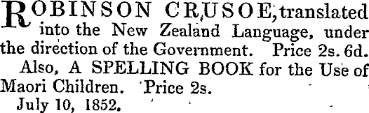 "ROBINSON CRUSOE, translated into the New Zealand Language, under the direction of the Government. Price 2s. 6d. Also, A SPELLING BOOK for the Use of Maori Children. Price 2s. July 10, 1852.