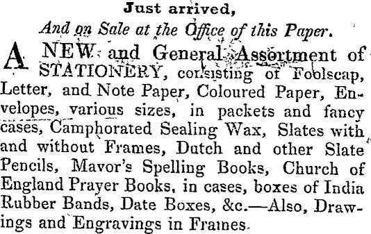 Just arrived, And an Sale at the 6ffice of this Paper. A. NEW^ajad GeneraiiAss&rjtsaent ofSTATIONARY, coring Y'FoWcap, Letter, and Note Paper, Coloured Paper, Envelopes, variojis sizes,' in packets and fancy cases,"Camphorated Sealing Was, Slates with and without Frames, Dutch and other Slate' Pencils, Mayor's Spelling Books, Church of England Prayer Books, in cases, boxes of India Rubber Bands, Date Boxes, &c. — Also, Drawings and Engravings in Frames-
