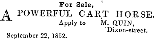 For Sale, A POWERFUL CART HORSE. Apply to M. QUIN, Dixon-street. September 22, 1852.