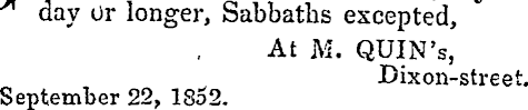 day Or longer, Sabbaths excepted, At M. QUIN's, Dixon-street. September 22, 1852.