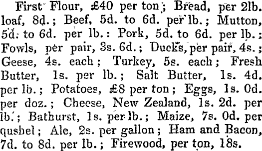 First' Flour, £40 per ton) Bfead, per 21b. loaf, Bd- ; Beef, sd. to 6d.'perlb.; Mutton, s'd: to 6d. per lb. : Pork, sd. to 6d. per lb. ; Fowls, per pair, 3s. 6d. ; DucFs, per pair, 4s. • Geese, 4s. each ; Turkey, ss. each ; Fresh Butter, Is. per lb. ; Salt Butter, Is. 4d. per lb. ; Potatoes, £8 per ton; Eggs, Is. Od. per doz.; Cheese, New Zealand, Is. 2d. per lb.'; Bathurst, Is. per-lb. ; Maize, 7s. Od. per qushel ; Ale, 2s. per gallon ; Ham and Bacon, 7d. to Bd. per lb. ; Firewood, per ton, 18s.