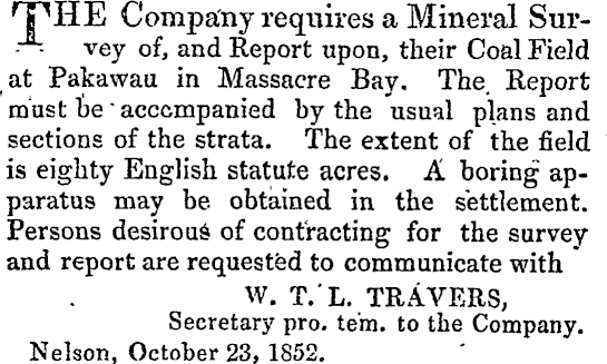 ''PHE Company requires a Mineral Survey - vey of, and Report upon, their Coal Field at Pakawau in Massacre Bay. The Report must be ■ accompanied by the usual plans and sections of the strata. The extent of the field ' is eighty English statute acres. A boring apparatus may be obtained in the settlement. Persons desirous of contracting for the survey and report are requested to communicate with W. T.L. TR AVERS, Secretary pro. te'm. to the Company. Nelson, October 23, 1852.