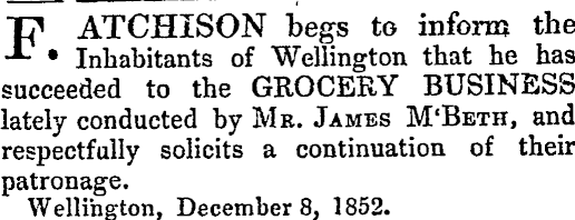 FATCHISON begs to inform the • Inhabitants of Wellington that he has succeeded to the GROCERY BUSINESS lately conducted by Mr. James M'Beth, and respectfully solicits a continuation of their patronage. Wellington, December 8, 1852.