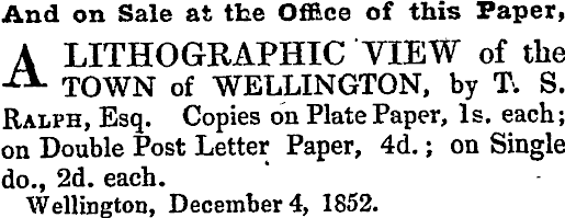 And on Sale at the Office of this Paper, A LITHOGRAPHIC VIEW of the TOWN of WELLINGTON, by T. S. Ralph, Esq. Copies on Plate Paper, Is. each; on Double Post Letter Paper, 4d. ; on Single do., 2d. each. Wellington, December 4, 1852.
