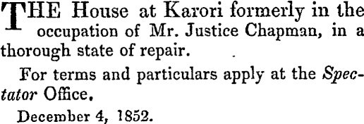 r pHE House at Karori formerly in the •^ occupation of Mr. Justice Chapman, in a thorough state of repair. For terms and particulars apply at the Spectator Office. December 4, 1852.