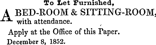 To Let Furnished, A BED-E-OOM & SITTING-ROOM, ■*■*■ with attendance. Apply at the Office of this Paper. December 8, 1852.
