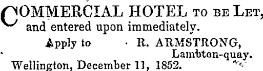 COMMERCIAL HOTEL to be Let, / and entered upon immediately. Apply to < R. ARMSTRONG, Lambton-quay. Wellington, December 11, 1852. *v