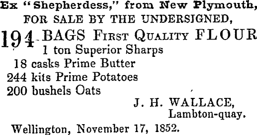 Ex "Shepherdess," from Mew Plymouth, FOR SALE BY THE UNDERSIGNED, I g^ BAGS Fiest Quality FLOUR 1 ton Superior Sharps 1 8 casks Prime Butter 244 kits Prime Potatoes 200 bushels Oats J. H. WALLACE, Lambton-quay. Wellington, November 17, 1852.