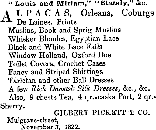 "Louis and Miriam," "Stately," &c. A LPAC A S, Orleans, Coburgs -^*- De Lames, Prints Muslins, Book and Sprig Muslins Whisker Blondes, Egyptian Lace Black and White Lace Falls Window Holland, Oxford Doe Toilet Covers, Crochet Cases Fancy and Striped Shirtings Tarletan and other Ball Dresses A few Rich Damask Silk Dresses, &c, &c. Also, 9 chests Tea, 4 qr.-casks Port, 2 qr.Sherry. GILBERT PICKETT •& CO. Mulgrave-street, November 3, 1822.