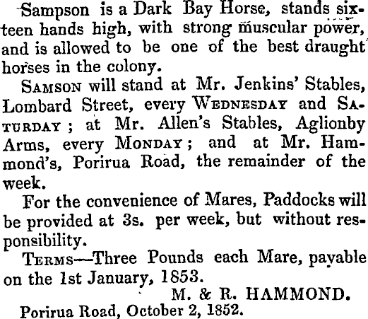 -Sampson is a Dark Bay Horse, stands sixteen hands high, with strong muscular power, ' and is allowed to be one of the best draught horses in the colony. Samson will stand at Mr. Jenkins' Stables, Lombard Street, every Wednesday and Saturday ; at Mr. Allen's Stables, Aglionby Arms, every Monday ; and at Mr. Hammond's, Porirua Road, the remainder of the week. For the convenience of Mares, Paddocks will be provided at 3s. per week, but without responsibility. Terms — Three Pounds each Mare, payable on the Ist January, 1853. M. & R. HAMMOND. Porirua Road, October 2, 1852.