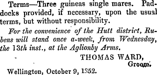 Terms — Three guineas single mares. Paddocks provided, if necessary, upon the usual terms, but without responsibility. For the convenience of the Hutt district, Rubens will stand once a-weeJc, from Wednesday, tlie 1 Zth inst., at the Aglionby Arms. THOMAS WARD, Groqph Wellington, October 9, 1552.