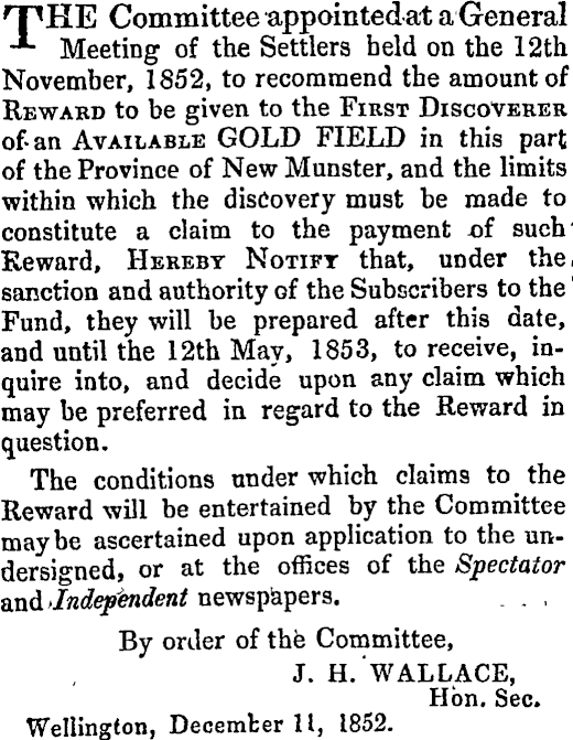 T^HE Committee uppointedat a General -*■ Meeting of the Settlers held on the 12th November, 1852, to recommend the amount of Reward to be given to the First Discoverer of an Available GOLD FIELD in this part of the Province of New Munster, and the limits within which the discovery must be made to constitute a claim to the payment at such' Reward, Hereby Notify that, under the. sanction and authority of the Subscribers to the ' Fund, they will be prepared after this date, and until the 12th May, 1853, to receive, inquire into, and decide upon any claim which may be preferred in regard to the Reward in question. The conditions under which claims to the Reward will be entertained by the Committee maybe ascertained upon application to the undersigned, or at the offices of the Spectator and Independent newspapers. . . , By order of the Committee, J. H. WALLACE, Hon. Sec. Wellington, December 11, 1852.