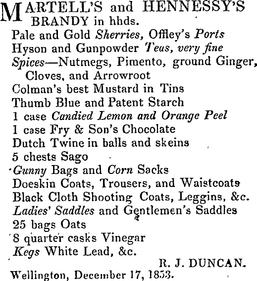 MARTELL'S and HENNESSY'S iy± BRANDY in hhds. Pale and Gold Sherries, Oflfley's Ports Hyson and Gunpowder Teas, very fine Spices — Nutmegs, Pimento, ground Ginger, Cloves, and Arrowroot Colmans best Mustard in Tins Thumb Blue and Patent Starch 1 case Candied Lemon and Orange Peel 1 case Fry & Son's Chocolate Dutch Twine in balls and skeins 5 chests Sago 'Gunny Bags and Corn Sacks Doeskin Coats, Trousers, and Waistcoats Black Cloth Shooting Coats, Leggins, &c. Ladies' Saddles and Gentlemen's Saddles 25 bags Oats '8 quarter caslis Vinegar Kegs White Lead, &c. It. J. DUNCAN. Wellington, December 17, 1853.