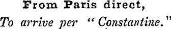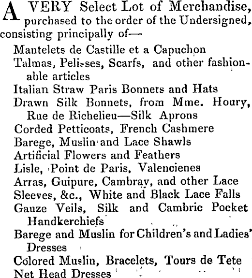A VERY Select Lot of Merchandise, purchased to the order of the Undersigned, consisting principally of — Mantelets de Castille et a Capuchpn Talmas, Pelisses, Scarfs, and other fashionable articles Italian Straw Paris Bonnets and Hats Drawn Silk Bonnets, from Mine. Houry, Rue de Richelieu — Silk Aprons Corded Petticoats, French Cashmere Barege, Muslin' and Lace Shawls Artificial Flowers and Feathers Lisle, Point de Paris, Valencienes Arras, Guipure, Cambray, and other Lace Sleeves, &c, White and Black Lace Falls Gauze Veils, Silk and Cambric Pocket Handkerchiefs ... Barege and Muslin for Children's and Ladies' Dresses < Colored Muslin, Bracelets, Tours de Tete * Net Head Dresses l ' ' ' " '