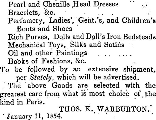 Pearl and Chenille .Head Dresses " n . Bracelets, &c. * ... Perfumery, Ladies 1 , "Geht.'s, and Children's Boots and Shoes Rich Purses, Dolls and Doll's Iron Bedsteads Mechanical Toys, Silks and Satins ■ Oil and other Paintings Books of Fashions, &c. To be followed by an extensive shipment, per Stately, which will be advertised. , The above Goods are selected with the greatest care from what is most choice of , the kind in Paris. THOS. K..WARBURTON/ ' January 11, 1854.