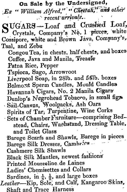 I On Sale by the Undersigned, \Ex " William Alfred," '[^Cfi&tuKffimi otheY .*• recent' arrivals:, ,v, v ' QXJGARS— Loaf and Gvvtstkd Loaf, ° Crystals, Company's N6. 1 pieces, white Cossipore, white and Brown Java, Company's, Taal, and Zebu T Congou Tea, in chests, half chests, and boxes Coffee, Java and Manila, Tfreadfe Patna Rice, Pepper Tapioca, Sago, Arrowroot Liverpool Soap, in 281b. and SSIb. boxes Belmont Sperm Candles, Mould Candles Havannab Cigars, No. 2 Manila CigarsDunlbp's 3\ T egrohead Tobaco, in small fig;* > SaiLCanvas, 'Woolpacks, Ash Oars Spirits of Tar* Turpentine, Wine Corks Sets of Chamber tVniture — comprising Bedstead, Chairs, Washstand, Dressing Table, and Toilet Glass Barege Scarfs and Shawls, Barege in pieces Barege Silk Dresses, Cambrs/'s- - Cashmere Silk Shawls Black Silk Mantles, newest fashions' Printed Mouseeline.de Lames Ladies' Chemisettes and Collars Sardines, in %, \, and large boxes Leather — Kip, Sole; and Calf, Kangaroo Skins, Shaft and Trace Harness