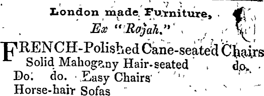 Ziondon made. Putniture, ■ , ' Ex '"Rayah."' , ' , .- "PRENCH-Polished Cane-seated Cfeairs *- Solid Mahogany Hair- seated ' , d.c> • Do: do. • Easy Chairs' ' ' ' r ' '" _ Horse-hair Sofas " *- ' \ '
