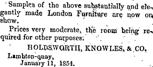 ' Samples of the above substantially and efcs gantly ma de Landoa Famjliiye are. now or* show. Prices very moderate* the room being re-^ quired for other purposes: ' r ' . HOLESiWQRTij, KNOWLES, &,CO. L*mb,ton-quay» January 11, 1854. ' ,_
