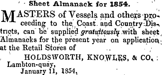 ' - Sheet Almanack for 1854. ]V/[ ASTERS of Vessels and others p.^ ceeding to the, Coast, and Country -.Dis-s tnets, can" he' supplied gratirifouslu . with sheet j Almanacks for the present year on application; ■ at the Retail Stores of , ' HOLDSWORTH, KNOWLES, & CO, : Lambton-quay, January 11, 1854,