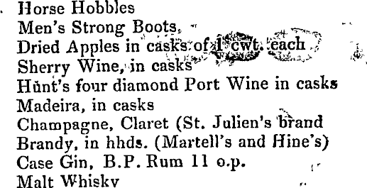 . Horse Hobbles Men's Strong Boots, - '" Dried Apples in caskVoM|cM; teach J l Sherry Wine/ in casks*" ur **"*•* Hunt's four diamond Port Wine in casks Madeira, in casks Champagne, Claret (St. Julien's brand Brandy, in hhds. (Martell's and Hines) Case Gin, B.P. Rum 11 o.p. Malt Whisky