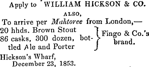 Apply to "WILLIAM HICKSON & CO. ALSO, To arrive per Mahtoree from London, — 20 hhds. Brown Stout ~l Y &c , 86 casks, 300 dozen, bot- > | rand> tied A le and Porter J Hickson's Wharf, December 23, 1853.