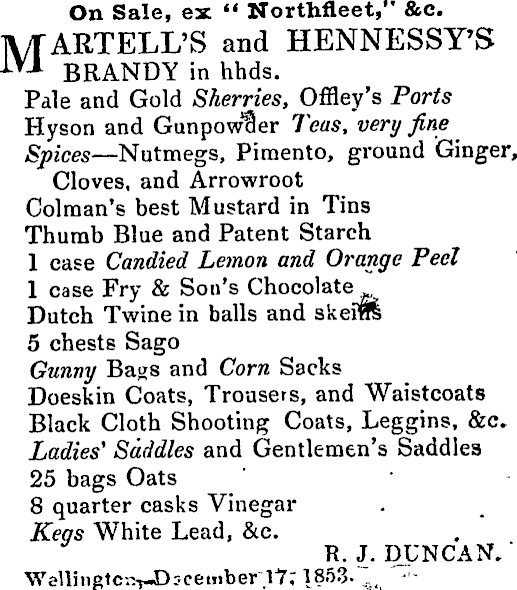 On Sale, ex " Northfleet," &c. IV/rARTELL'S and HENNESSY'S iV -* BRANDY in hhds. Pale and Gold Sherries, Offley's Ports Hyson and Gunpowder Teas, very fine Spices — Nutmegs, Pimento, ground Ginger, Cloves, and Arrowroot Colraan's best Mustard in Tins Thumb Blue and Patent Starch 1 case Candied Lemon and Orange Peel 1 case Fry & Son's Chocolate Dutch Twine in balls and skefil 5 chests Sago Gunny Bags and Corn Sacks Doeskin Coats, Trousers, and Waistcoats Black Cloth Shooting Coats, Leggins, &c» Ladies' Saddles and Gentlemen's Saddles 25 bags Oats 8 quarter casks Vinegar Kegs White Lead, &c. R. J. DUNCAN. " Wellsngtc-.> t -Dr.cemberl J r; 1853- , '-