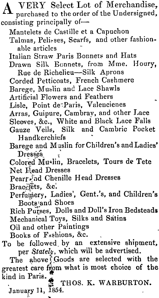 A VERY Select Lot of Merchandise, purchased to the order of the Undersigned, consisting principally of — Mantelets de Caslille et a Capuchon Talmas, Pelisses, Scarfs, and other fashionable articles Italian Straw Paris Bonnets and Hats Drawn Silk Bonnets, from Mme. Houry, Rue de Richelieu — Silk Aprons Corded Petticoats, French Cashmere Barege, Mublin and Lace Shawls Artificial Flowers and Feathers Lisle, Point de-Paris, Valencienes Arras, Guipure, Cambray, and other Lace Sleeves, &c, White and Black Lace Falls Gauze Veils, Silk and Cambric Pocket H andkerchiefs Barege and Muslin for Children's and Ladies' Dresses^ t Colored Mu«lin, Bracelets, Tours de Tete Net Read Dresses Pearr>fnd Chenille Head Dresses Bracspts, &c. Perfumery, Ladies', Gent.'s, and Children's Boots^and Shoes Rich Pulses, Dolls and Doll's Iron Bedsteads Mechanical Toys, Silks and Satins Oil and other Paintings Books of Fashions, &c. To be followed, by an extensive shipment, per Stateli/, which will be advertised. The above |. Goods are selected with the greatest care frjpm what is most choice of the kind in Paris. A $ THOS. K. WARBURTON. January 11, 1854.
